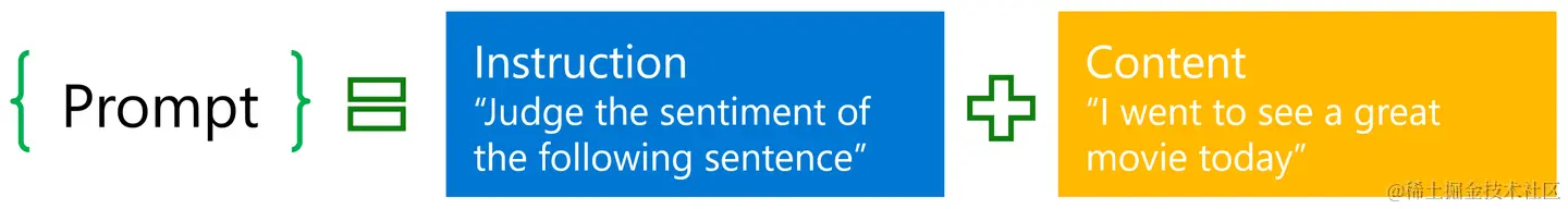 大多数的prompt具有以下的形式:由「指令」(instruction)和「内容」(content)两部分构成。其中,指令部分为我们需要大模型做的事,如“判断下列句子的情感”,而内容则为真正的句子,如“我今天很高兴”。注意,并不是所有的prompt都必须是这样的形式,如比较简短的prompt:“中国的首都在哪里”、“模仿百年孤独的开头写一段话”等这种言简意赅的prompt就只有指令、内容为空。