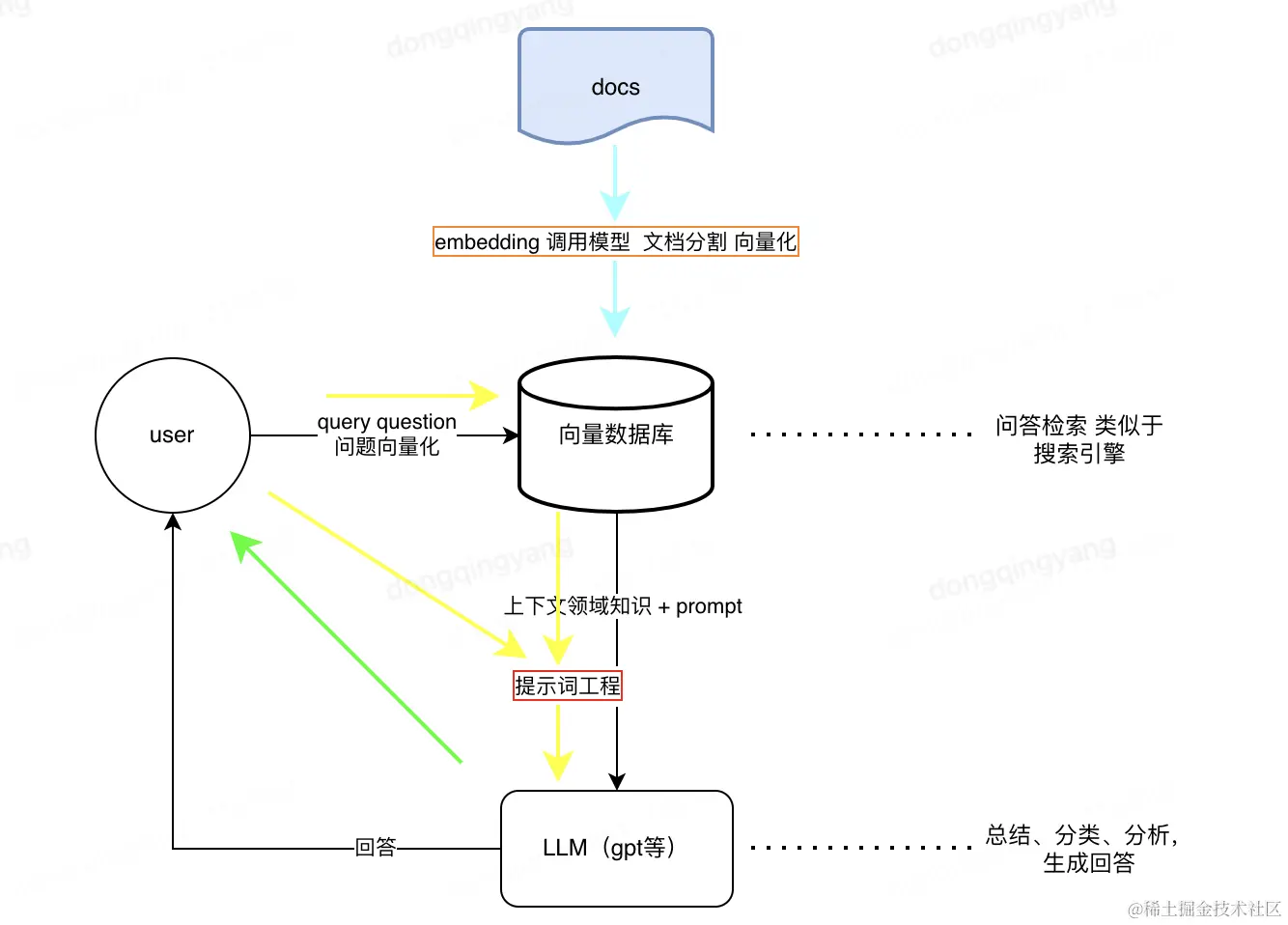 3.生成 Generation: 将检索到的文档与原始问题一起作为提示 (Promot)输入到LLM中,生成回答。