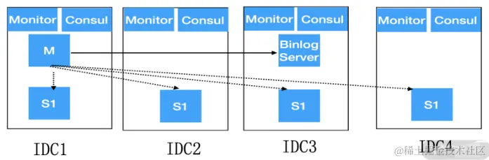 4、这一代开始需要支持跨 IDC 复制。需要引入监控 Monitor,配合 consul 注册中心。多个 IDC 中 Monitor 组成分布式监控,把健康的 MySQL 注册到 consul 中,同时将从库复制延迟情况也同步到 consul 中。
