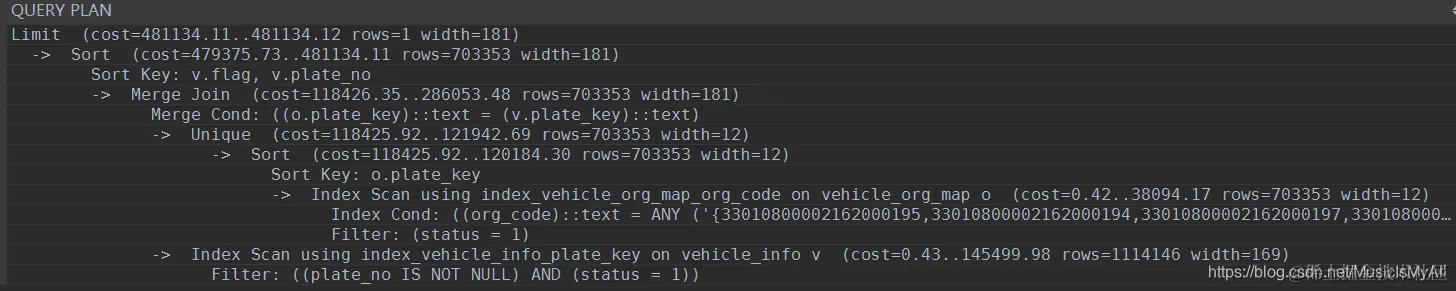 上图中的 Index Scan代表索引扫描, Index Cond代表索引命中,后面是命中的具体的索引; Filter是过滤条件,跟具体的sql有关, 注意sort, sort中应该是有两行,下面的图示中能够看到, 第一行代表对那个键进行排序, 第二行是排序方法(主要有内存排序和磁盘排序,应该避免磁盘排序)和数据大小。
