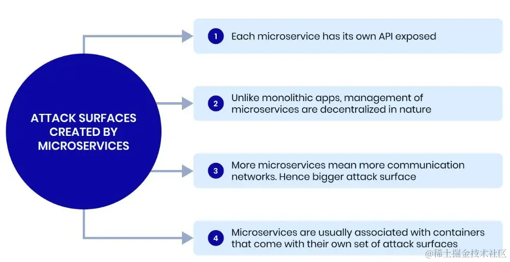 - 当您将单体 软件分解为微服务时,您实际上是在增加恶意行为者潜在的入口点。攻击面扩大。从 API 到数据库连接和第三方集成,跟踪入口点变得像噩梦一样。