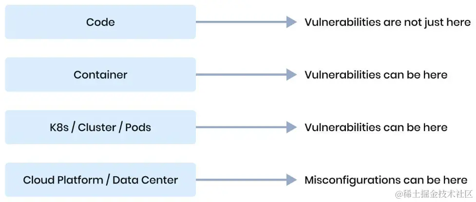保护您的代码库只是拼图的一部分。应采用云原生安全方法来缓解基础层中的漏洞或错误配置。这有助于您从层面上看待安全。