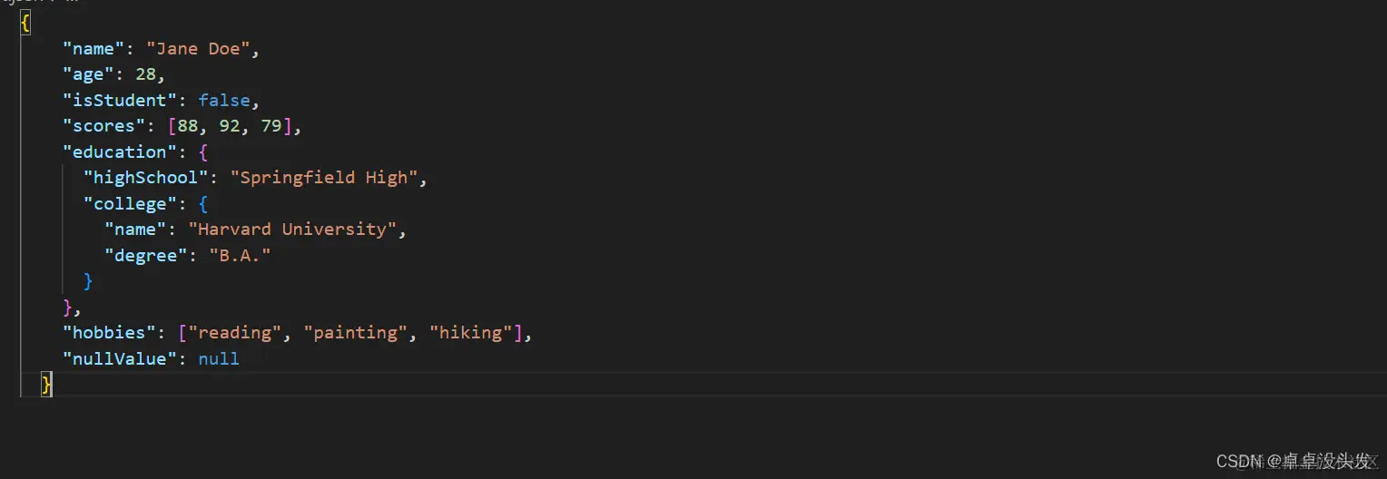在这个示例中,我们定义了一个包含不同数据类型的对象,包括字符串、数字、布尔值、数组、嵌套对象和null值。
