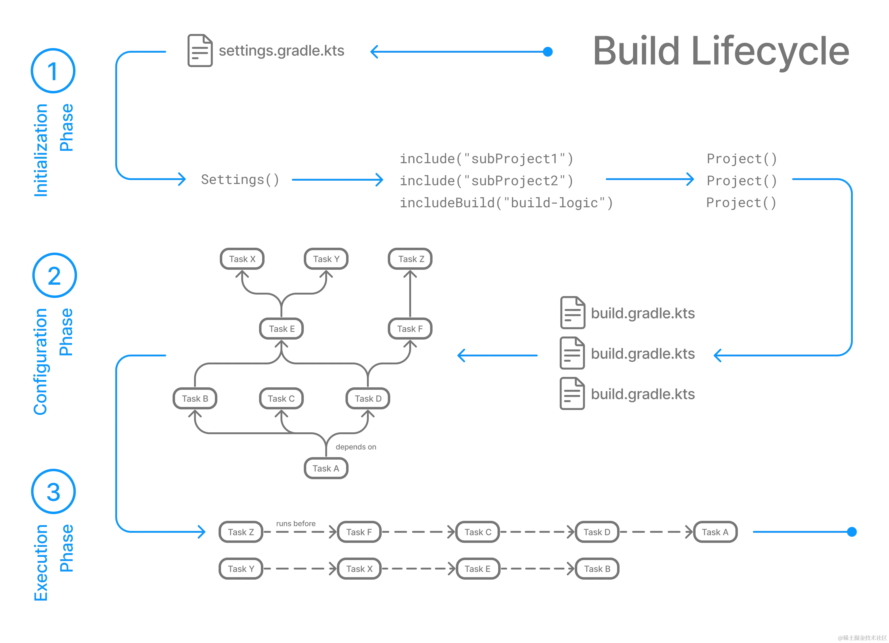 初始化阶段,分两步,一步是init Script,Gradle首先读取解析gradle.properties,配置全局参数。第二步,会去找读取解析settings.gradle,生成Settings对象,并生成相应子项目的Project对象。