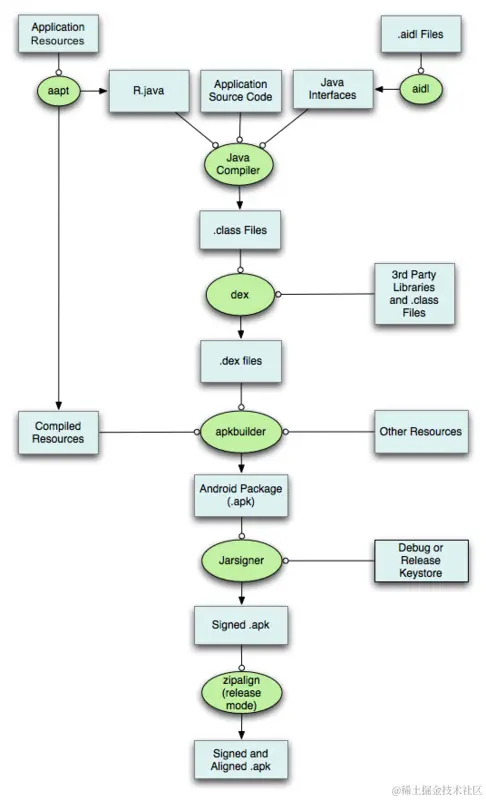 源码class文件和第三方jar或者library通过dx工具打包成dex文件。dx工具的主要作用是将java字节码转换成Dalvik字节码,在此过程中会压缩常量池,消除一些冗余信息等