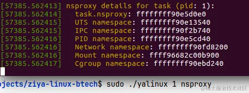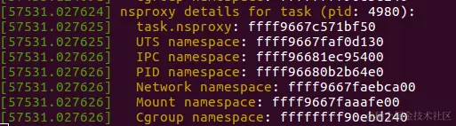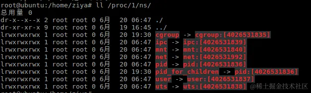 再从内核态查看每个进程的namespace。了解Linux的都知道,Linux中的所有进程都是1号进程的子孙进程,言外之意就是所有进程都会继承1号进程的namespace,来看看是不是这么回事