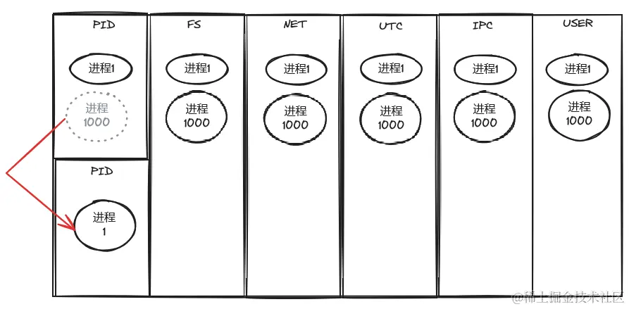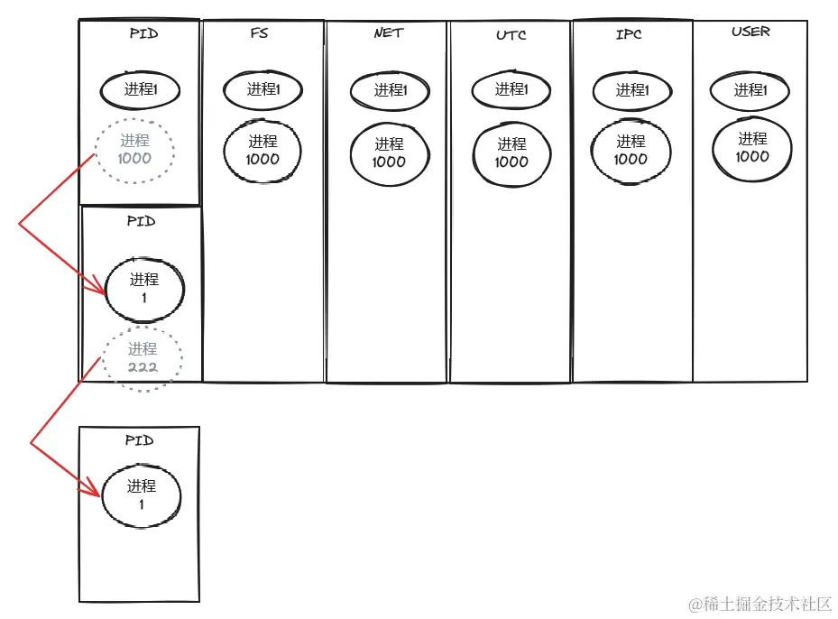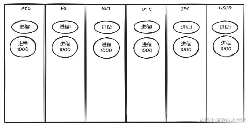 Linux namespace差不多就是这种感觉,如果你没有给进程创建新的namespace的时候,所有的进程都在默认的namespace中