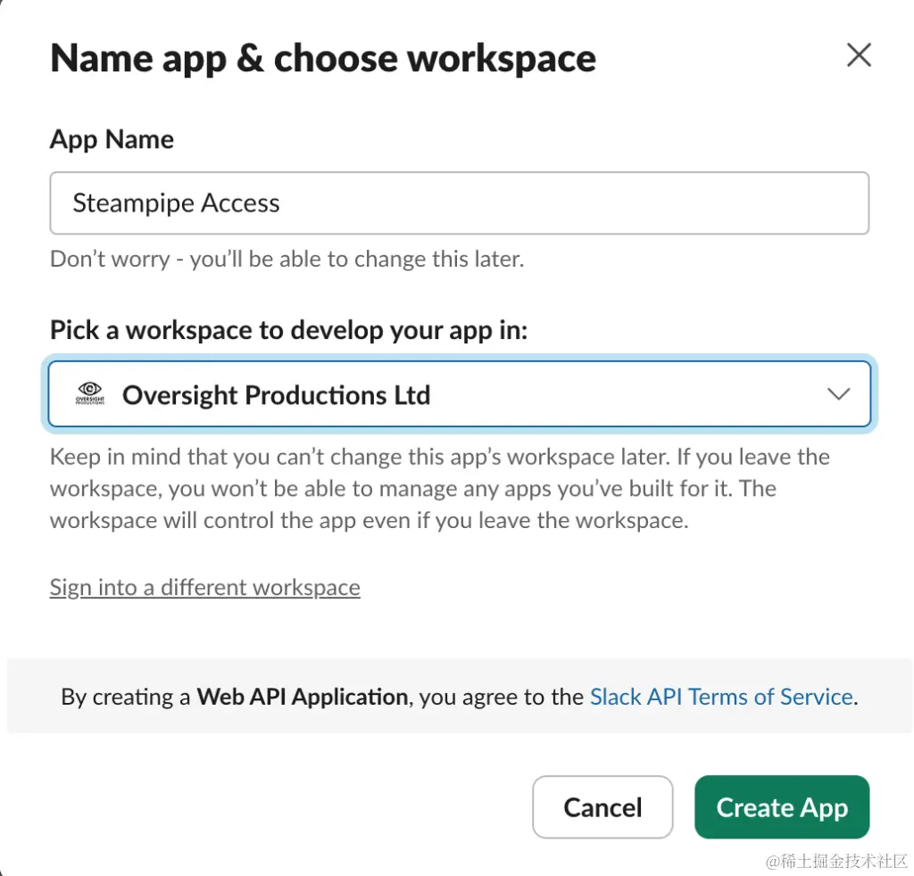 从这里,我们可以创建一个新应用,选择“从头开始”,然后给它一个名称。“应用”是 Slack 指 Steampipe 的第三方访问服务: