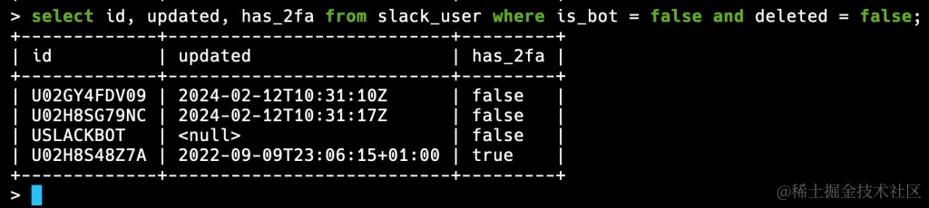 在我们愤怒地查询之前,让我们快速查看一下 slack_user 表: