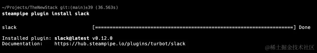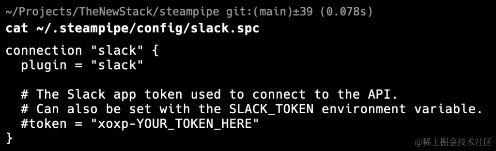 现在返回你的 shell,并将该令牌添加到 Steampipe 的 Slack 配置文件中: