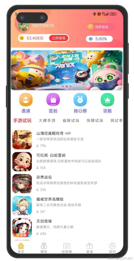 举个栗子,对于游戏试玩类APP,我们只需要在设计上略微调整。由原先的签到直接给金币,改为佣金比例加成。