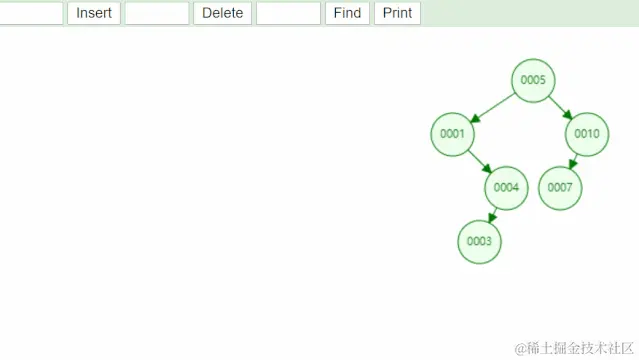 节点删除过程如下,依次删除值等于 4 的节点, 值等于 5 的节点,等于 10 的节点,注意观察调整过程,如何保证删除节点后依然是一颗二叉查找树的。