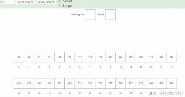 线性查找的关键码如果位于序列后部,查询性能就会变差。如下查找 735 时,几乎快搜索一遍: