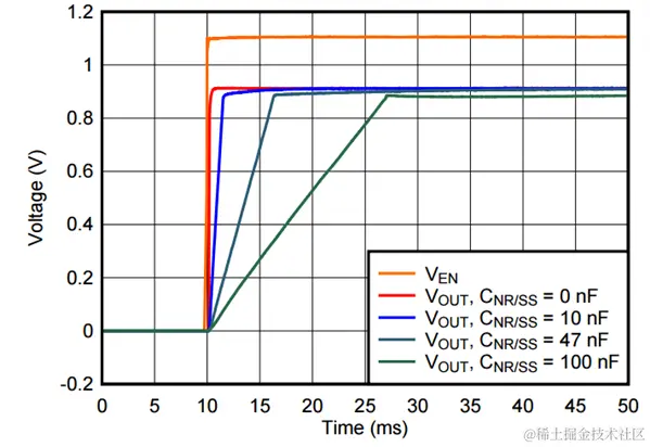 如您所见,增加CNR/SS值会导致启动时间延长,从而防止浪涌电流尖峰并可能触发限流事件。请注意,某些具有NR引脚的LDO不会实现软启动功能。它们能够实现快速启动电路,即便使用大型降噪电容器也有助于实现超短启动时间。