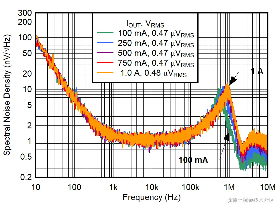 时域分析并非易事。因此,检查噪声的主要方法有两种:跨频率检查和以积分值形式检查。您可以使用频谱分析仪来识别LDO输出端的各种交流元件。应用报告“如何测量LDO 噪声”详细介绍了噪声测量方法。图2描绘了1A低噪声LDO TPS7A94的输出噪声。