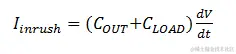 如图 4 所示,较大的CNR/SS值会产生更好的噪声系数。在某个时刻,增大电容将不再降低噪声。剩余的噪声来自误差放大器、FET等。添加电容器还会在启动期间引入RC延迟,从而导致输出电压以较慢的速度斜升。当输出或负载上存在大容量电容并且您需要减轻浪涌电流时,这是有利的。公式1将浪涌电流表示为: