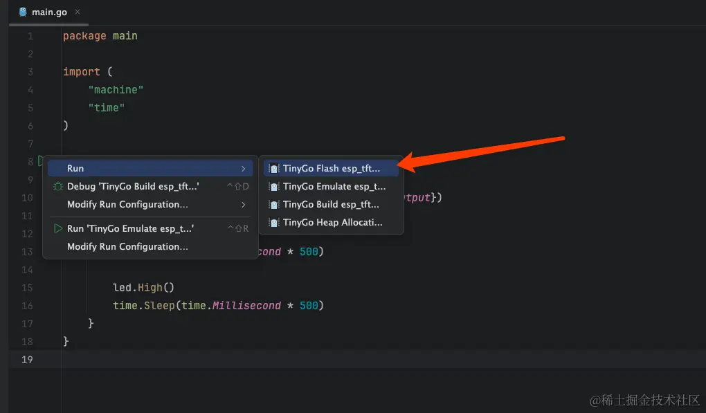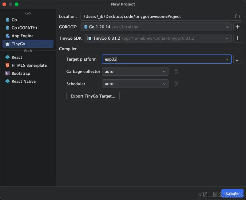 新建tinygo工程,选择go编译器和tinygo编译器,以及目标设备