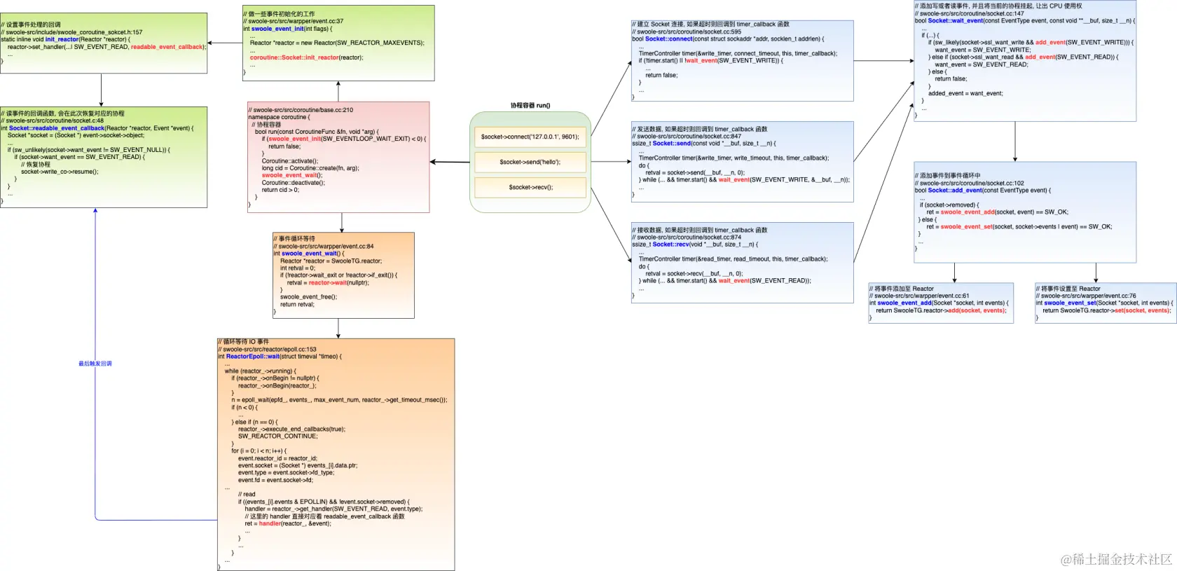 这段代码主要是使用 Socket 的协程客户端与本地的 9601 端口建立连接,并且发送、接收数据。在分析源码之前,我对这次的源码做了一个图解梳理,把整个调用链路上的函数串联了起来。我们可以先对整体有个大致的了解,便于后面分析源代码。