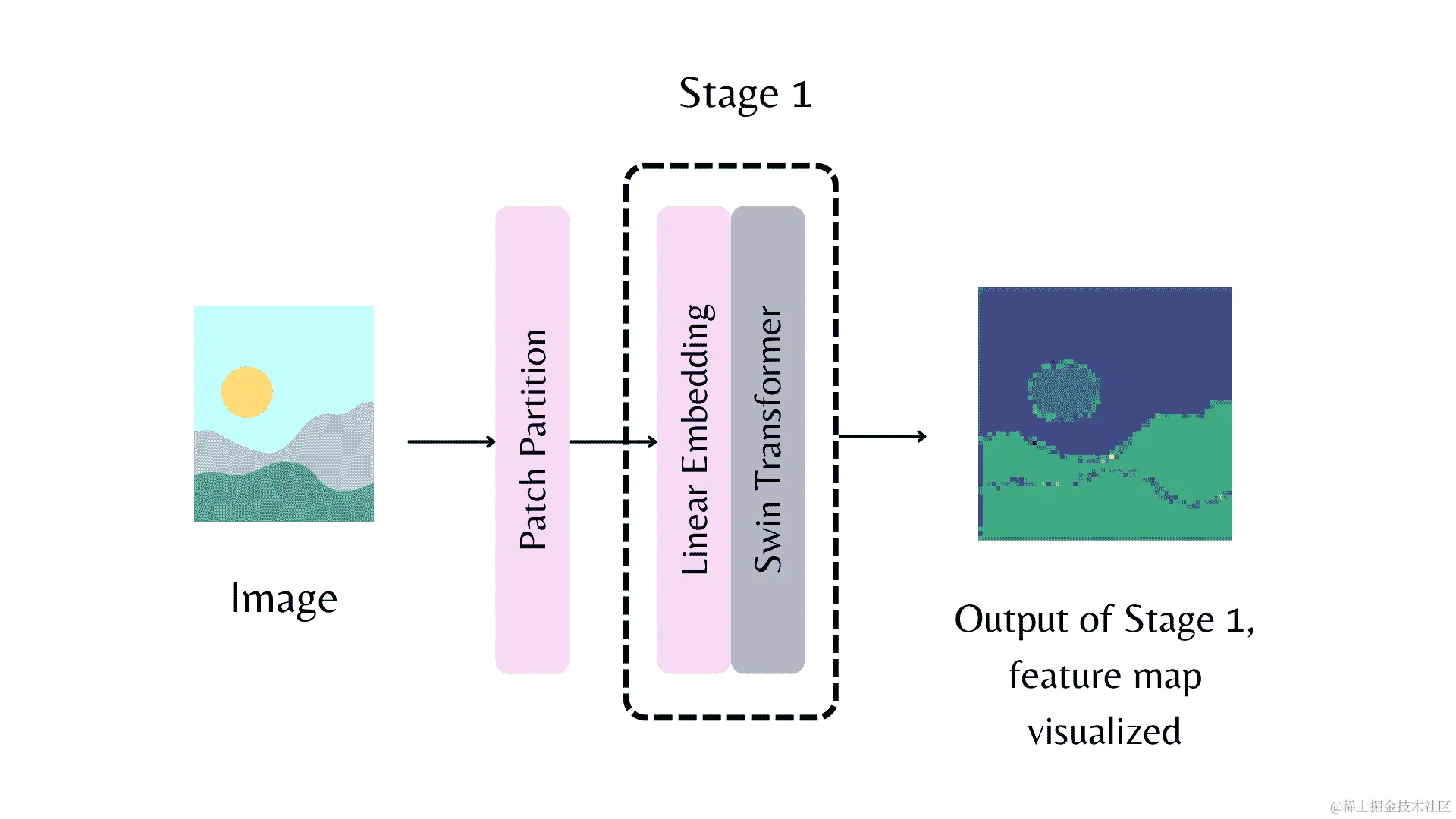 让我们通过一个示例来看看。请注意,out_indices=(0,)会导致产生模型的 stem。Stem 指的是第一个特征提取阶段之前的阶段。在上图中,它指的是 patch 分区。我们希望从 stem、第一阶段和第二阶段获取特征图。