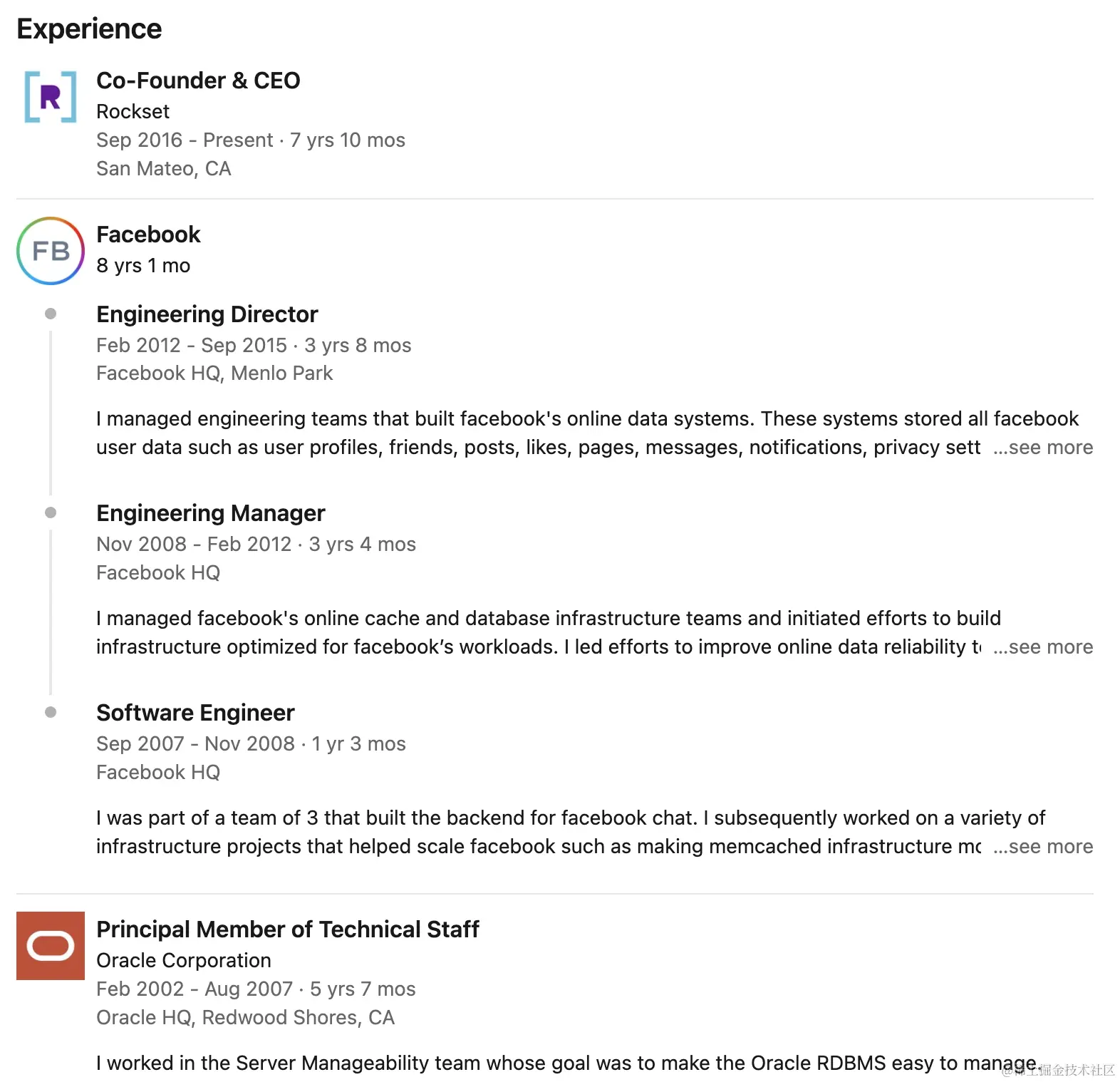 Rockset是由Venkat Venkataramani和Dhruba Borthakur在2016年共同创立的。这之前他们在2007~2015期间是Facebook同事,RocksDB就是他们做的产品,一个fork自LevelDB的开源的高性能KV存储引擎。