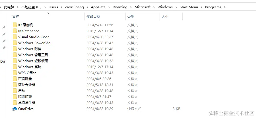 另一个是针对每个用户有一个单独的开始菜单,位于C:\Users\用户名\AppData\Roaming\Microsoft\Windows\Start Menu\Programs 目录下。