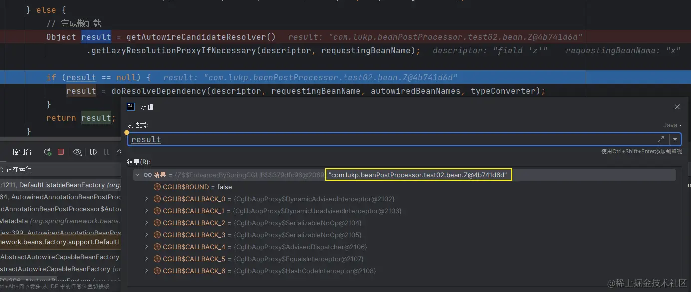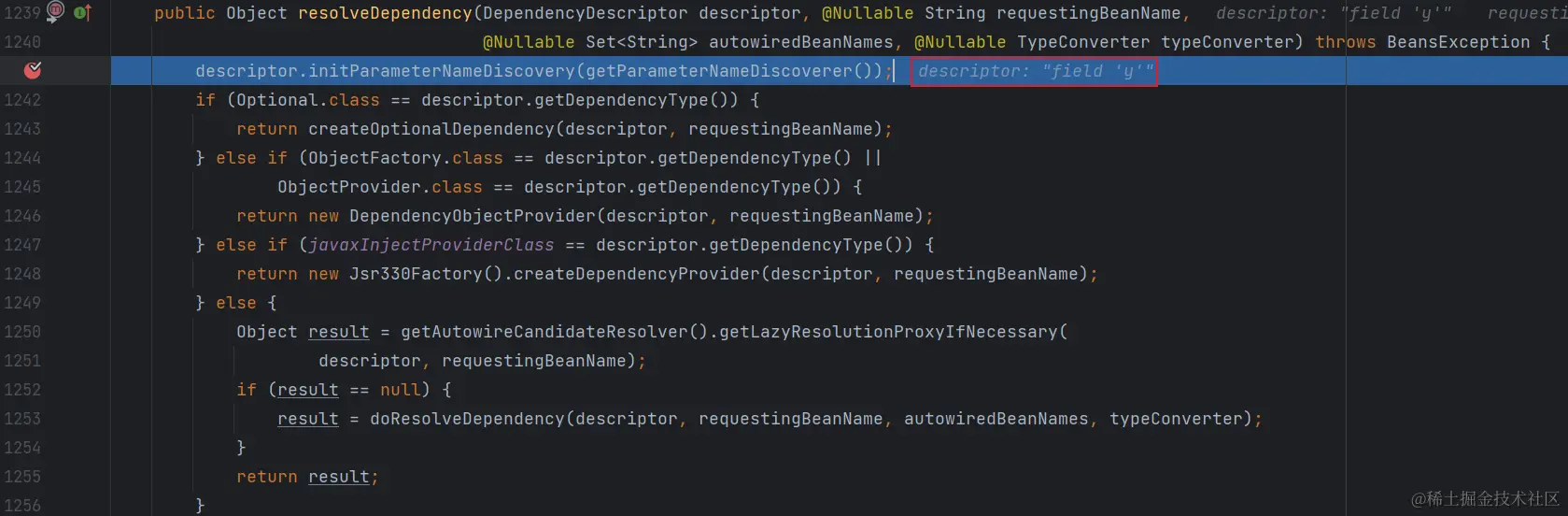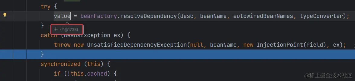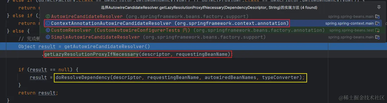 - 可以看到的是我们上述讲的其实都是下面标黄线的方法:doResolveDependency 方法,而红线的就是完成懒加载的地方。