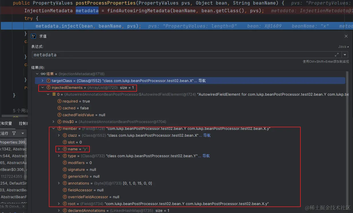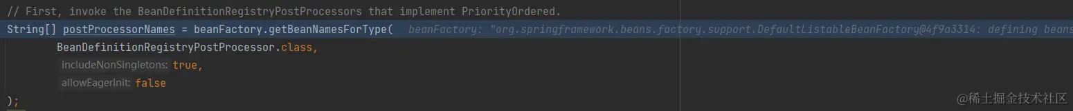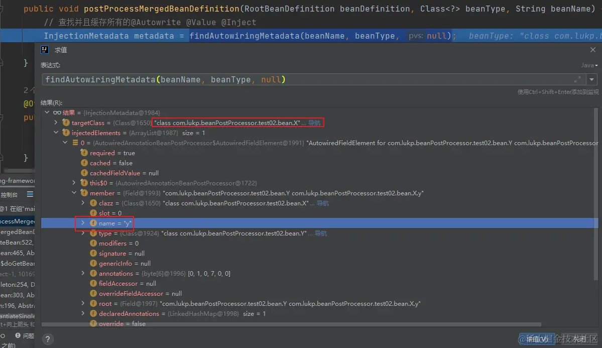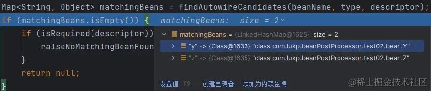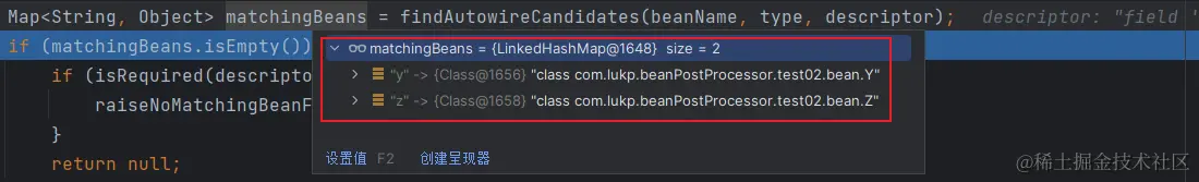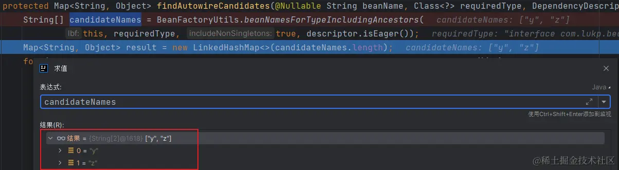 - 可以看到当前在被寻找的是 I 接口,我们将该方法执行完成就会发现 candidateNames 的结果就是 y 和 z: