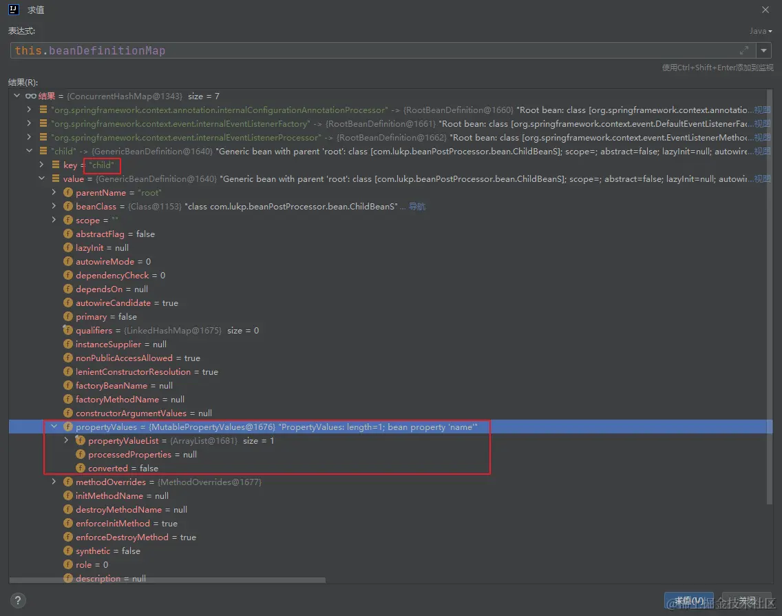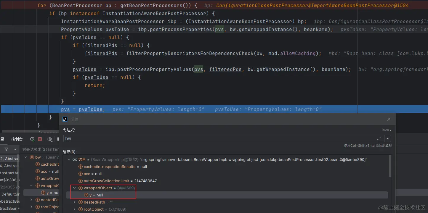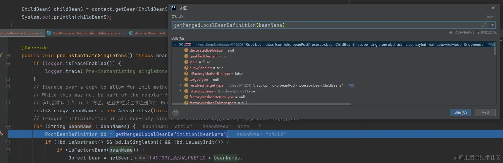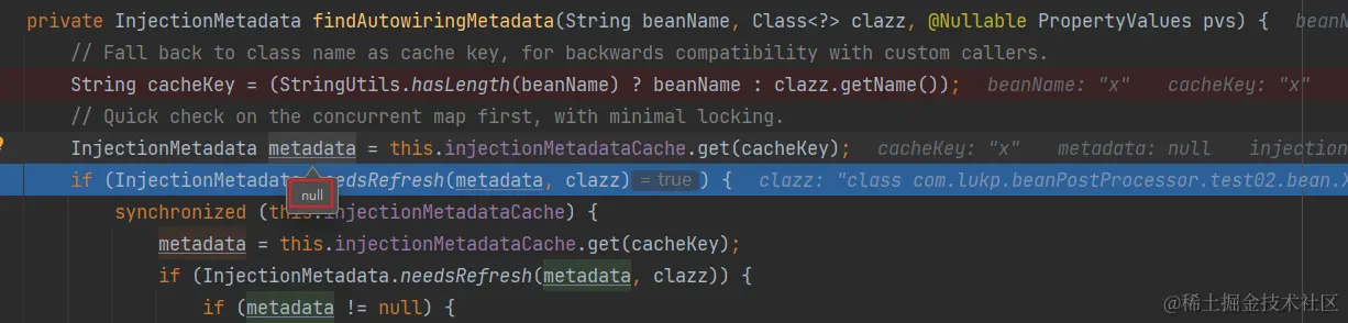 然后,下面会获取到当前的实例化出来的Bean对象,和实例化对象的类型,并且判断当前对象的类型是否为NullBean.class类型。
