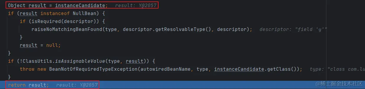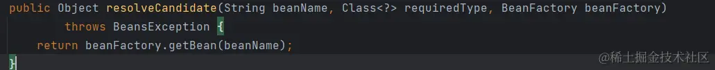- 上述的两个条件都是满足的,就会直接走到第 5 行,resolveCandidate 方法其实也是 getBean 的逻辑: