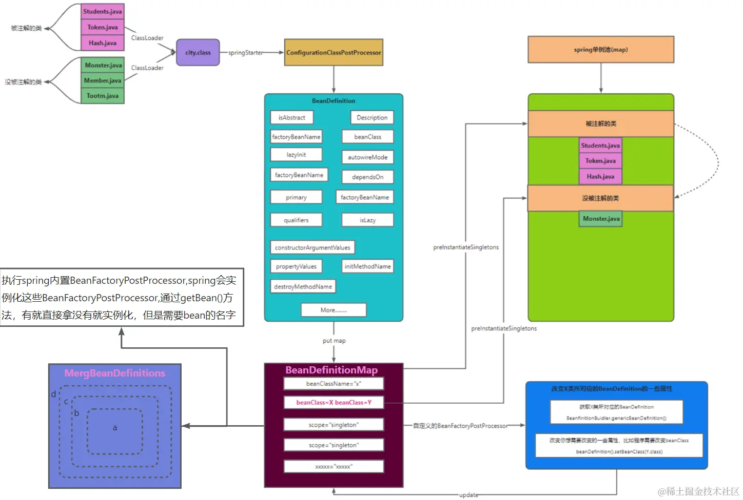 - 看到上图,在进入到MergeBeanDefinition之前会执行spring内置的beanFacotryPostProcessor,并且是通过getBean()方法来获取,拿到之后就执行BeanFactoryPostProcessor方法,进行bean的实例化。如果没有getBean()方法第一次的去寻找的时候没有找到,就会去BDMap中寻找。
