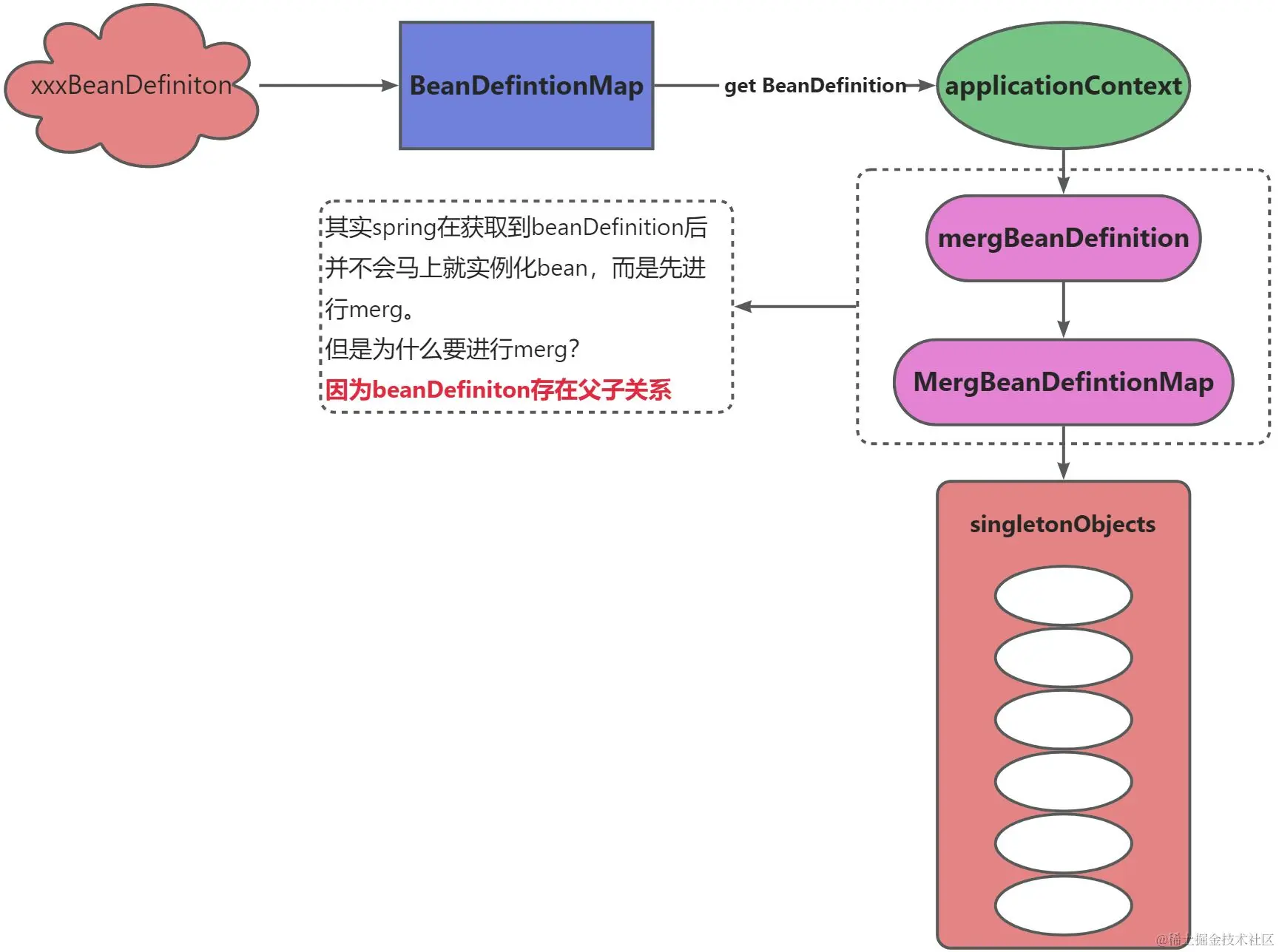 - ok,我现在再回头来想,前面是不是说过其实spring在实例化BeanDefintion的时候并不是从BeanDefinitonMap中取的,其实是从mergedBeanDefinitions这个集合中获取的,这个才是经过一系列的beanDefiniton的合并之后完整的beanDefiniton,通过获取到这里面的BeanDefintion来完成Bean的实例化操作。