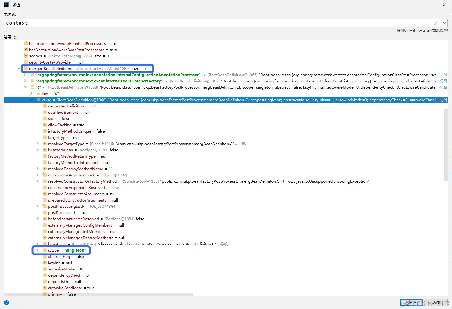 - 并且通过Debug我们也可以看到真相了,确实在mergedBeanDefinitions中的c类的beanDefintion信息中scope为singloten。