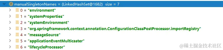 - 在spring中我们绝大部分的bean是通过beanDefiniton进行实例化的,但是spring同时也允许你跳过这一步,直接将一个Bean丢到单例池中,但是这里的单例池并不是singletionObjects,是manualSingletonNames,有点区别:手动注册的单例的名称列表,按注册顺序。