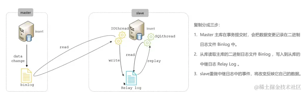 从库重做中继日志中的事件,这样数据就保持同步了。