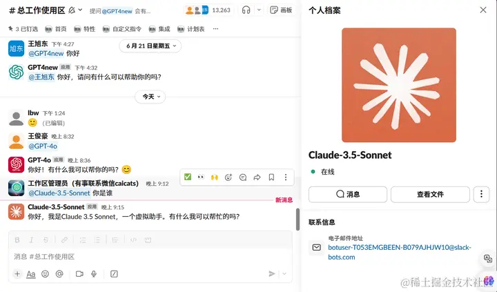 大佬通过Claude官网的API在Slack配置的一个应用,加入他的Slack工作区就能直接使用Claude3.5模型。而且工作区里面还有GPT4可以使用。目前Slack可以在电脑、手机、网页使用,可以说是很方便了。