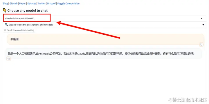 进入竞技场后点击Chat,然后选择Claude3.5模型就好。需要注意的是,模型竞技场有些时候会因为没有次数额度下架Claude3.5模型使用。你可以去试试看,如果没有的该模型选项的话,晚会再进去试试。