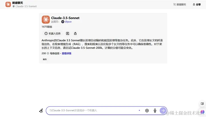 Poe已经上架了Claude3.5的机器人,并且免费用户即可使用。免费用户每天有3000积分,每日重置一次,对于GPT-4o模型来说,每次对话消耗200积分,也就是每天可以免费对话15次。尝个鲜还是不错的。