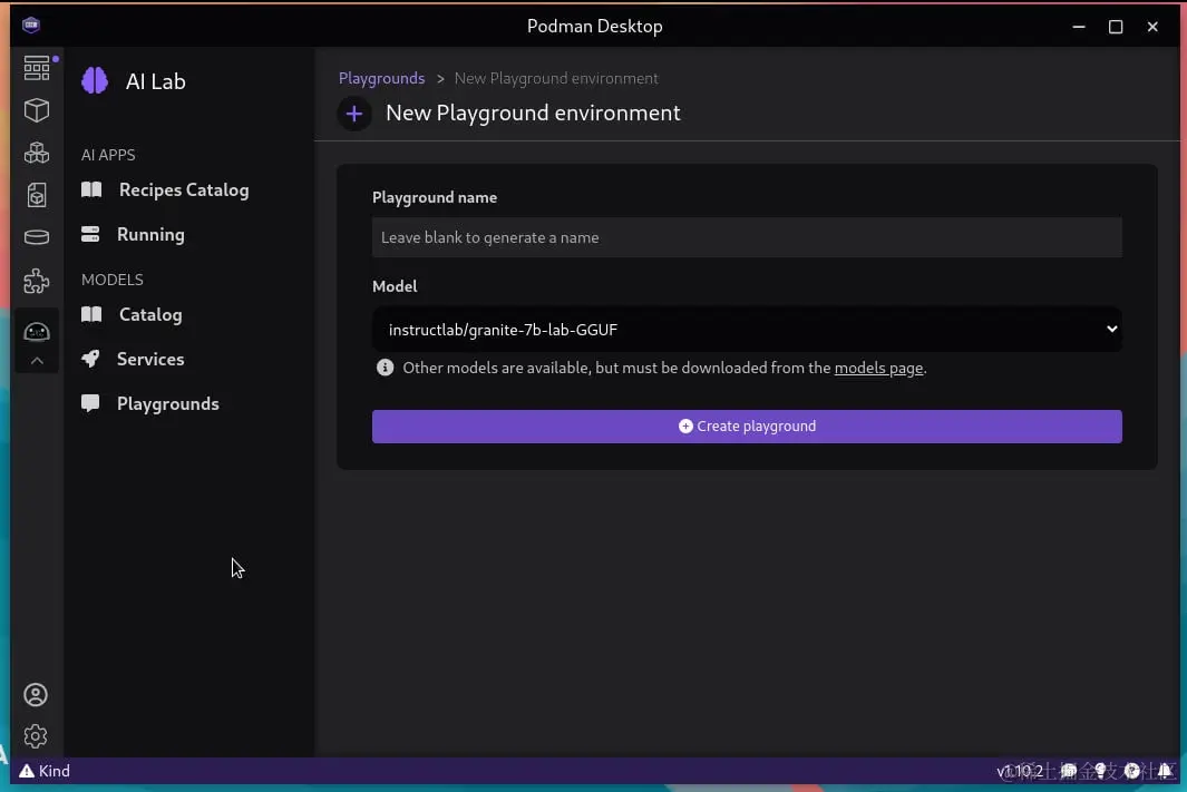 单击模型下的游乐场。在结果窗口中,你可以给游乐场指定一个特定名称,也可以将游乐场名称字段留空,Podman 将分配一个随机名称。确保选择了正确的模型,然后单击创建游乐场。新的游乐场应该几乎立即可用。
