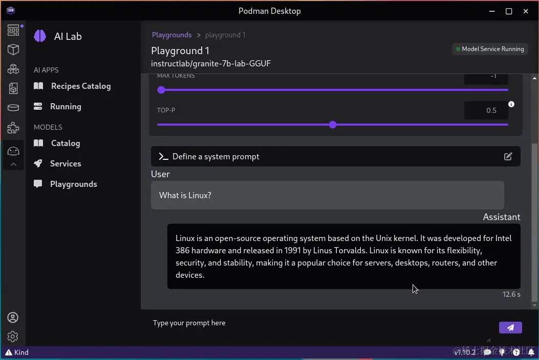 我快速测试了 Podman AI 实验室,并输入了 Linux 是什么?几乎立即,AI 实验室就给出了一个有效答案(图 5)。