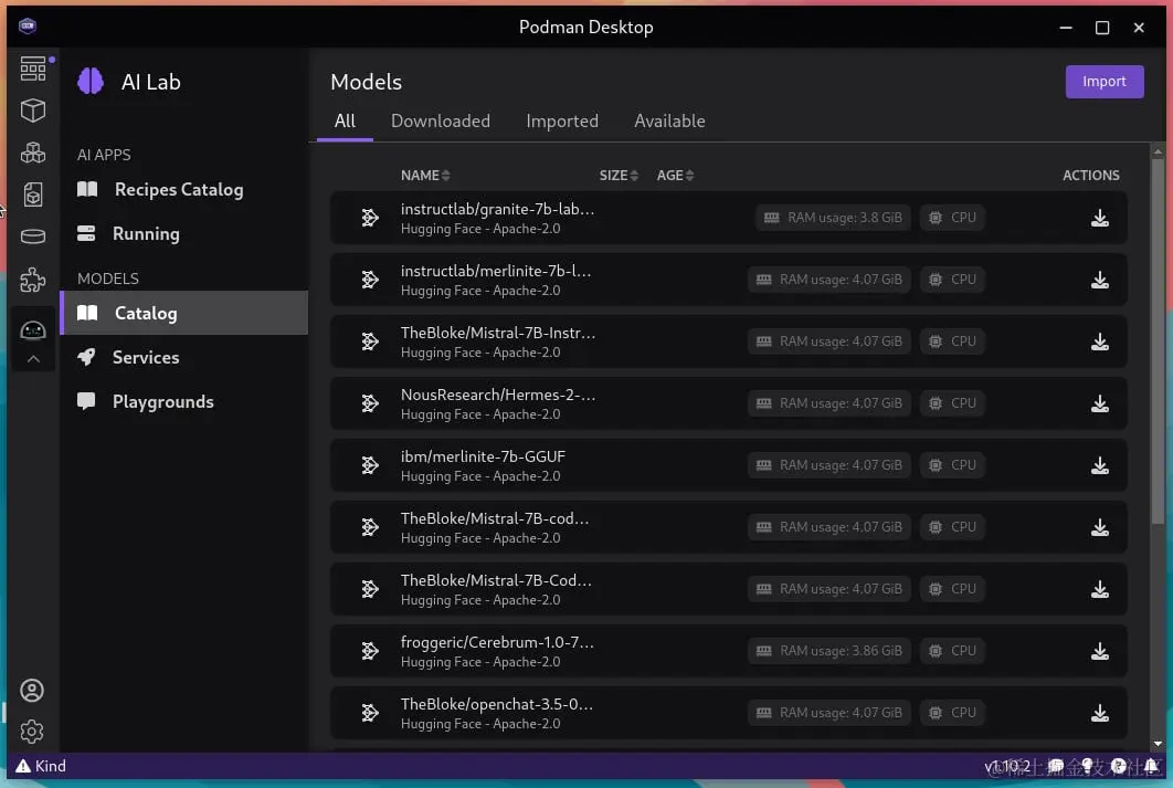 现在是下载你的第一个大型语言模型的时候了。为此,请单击侧边栏中的 Podman AI Lab 图标,然后单击目录。在这里,你将看到可用 LLM 的列表。选择一个,然后单击关联的下载按钮(图 2)。