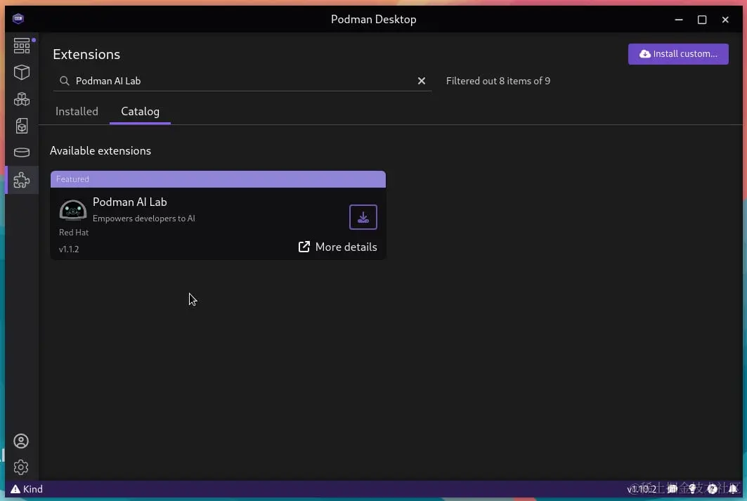 Podman Desktop 启动并运行后,是时候安装 Podman AI Lab 扩展了。为此,请单击侧边栏中的扩展图标(拼图图标)。在结果窗口(图 1)中,在搜索栏中输入 Podman AI Lab,然后按 Enter。