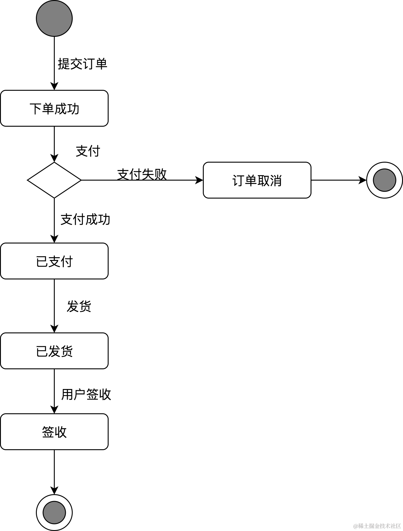- 结束点: 活动结束节点,一个活动图中可以有多个开始状态,通常以空心双环图标表示;