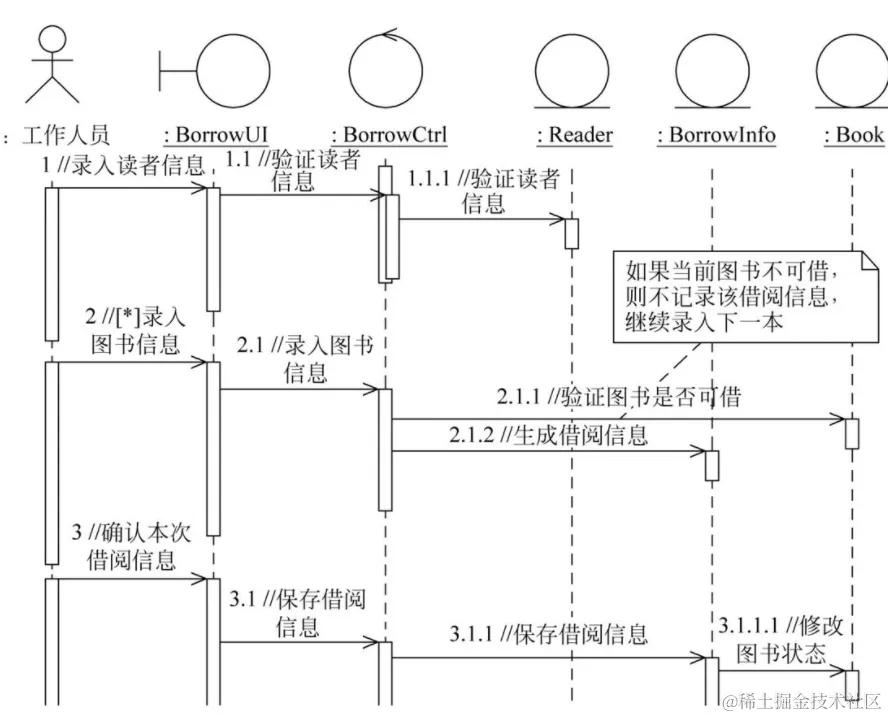 - 对象和生命线: 生命线头上那个方正的框里面存放的就是对象,对象有自己的名字,生命线其实就是从上到下的一个虚线。生命线标示一个对象存在的生命周期。这个对象可以是类对象,也可以是更大粒度的参与者,比如组件、服务器、子系统等