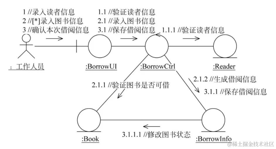UML中的通信图(也叫协作图)也是用来表示对象之间的关系及交互活动,和顺序图是同构的,两者之间基本可以相互转换,差异点通信图不支持时序图中的交互片段。