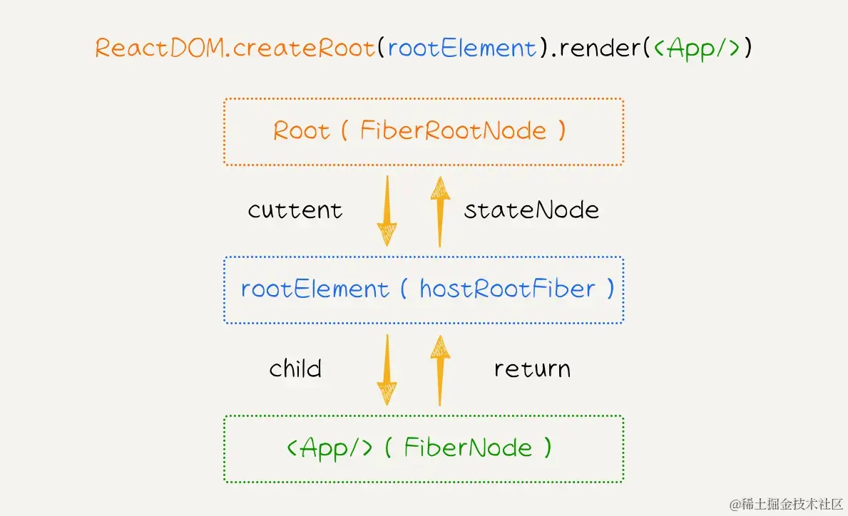 ReactDOM.createRoot()函数生成一个新的Root对象,它在源码中是FiberRootNode类型,充当了 React 应用的根节点。rootElement则是要渲染到的 DOM 节点,它在源码中是hostRootFiber类型,作为 React 应用的根 DOM 节点。render()方法将组件<App/>渲染到根节点上。在这个过程中,React 会创建一个代表<App/>组件的FiberNode,并将其添加到Root对象的 Fiber 树上。