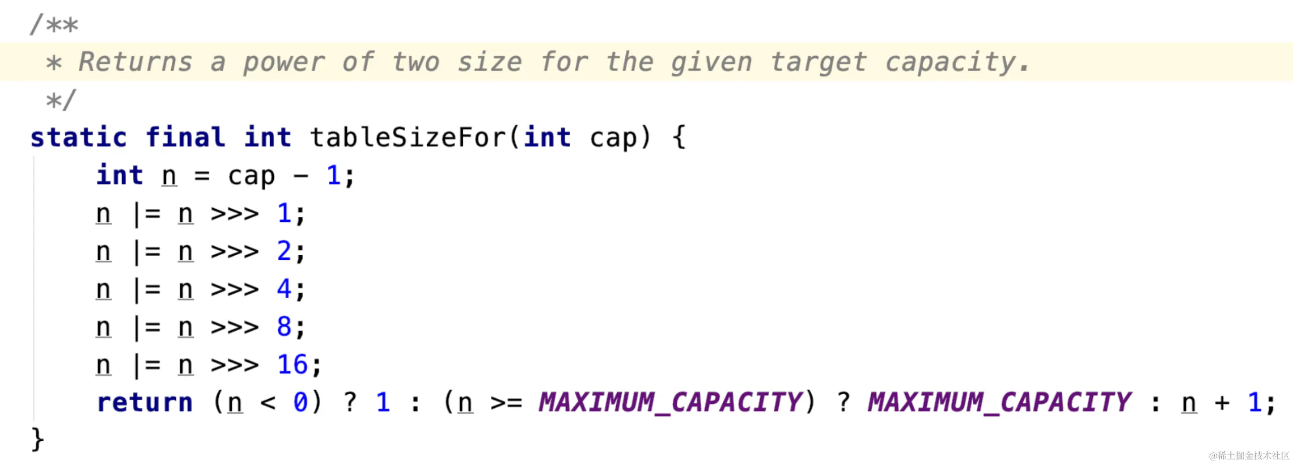 补充说明:下图是详细过程,算法就是让初始二进制右移1,2,4,8,16位,分别与自己位或,把高位第一个为1的数通过不断右移,把高位为1的后面全变为1,最后再进行+1操作,例如:初始化 new HashMap(50),实际的大小是64,2的6次方=64。