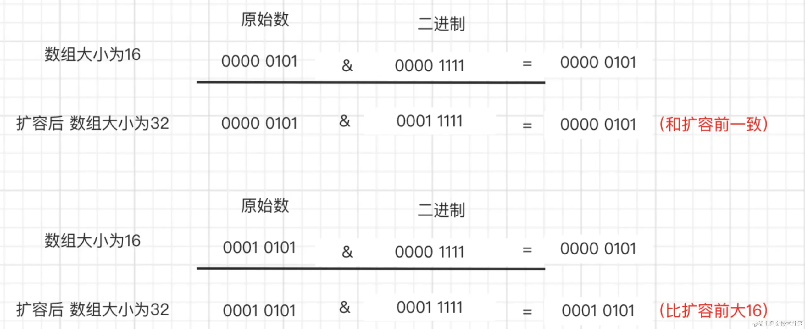 扩容之后数组长度是原来的2倍,即16,假设我们重新算一遍A的位置,那么应该是:
