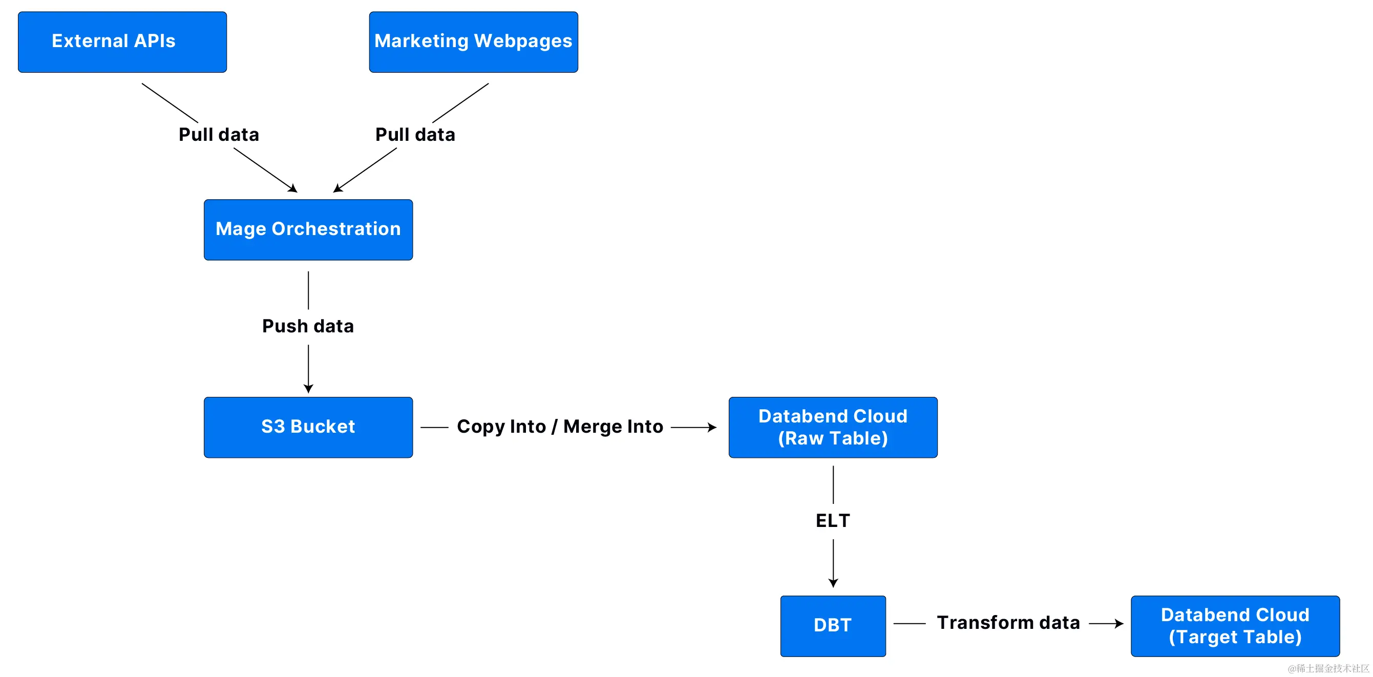 这一阶段,Toco 主要从应用程序的 API 和市场营销活动网页中获取数据,然后利用 Mage orchestration 来管理这些数据处理流程。Orchestration 会对端点的多个请求进行协调,以收集数据。然后将其向前推送到 S3 Bucket,Databend 从 S3 Bucket 中读取数据。Toco 还会在数据库中运行 DBT 流程,以转换和准备数据,这构成了一个非常强大的数据仓库。