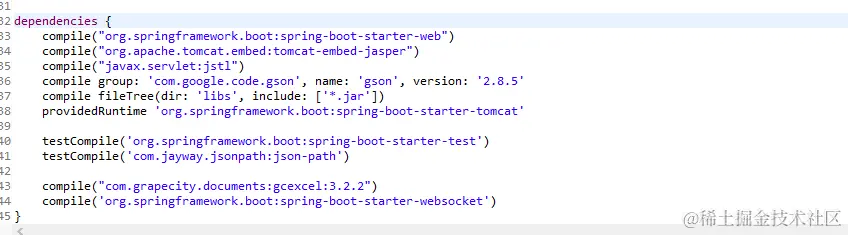 后端的准备工作,首先安装gradle作为包管理器。当然,这里也可以用其他工具来代替,例如maven,或者源生引入jar包的方式将需要用到的jar包引入进来。然后创建springboot工程配合搭建gradle引用GCExcel以及后面协同需要用到的websocket。