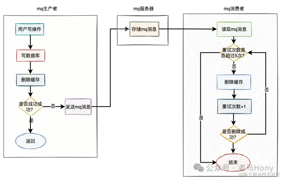 在binlog订阅者中如果删除缓存失败,则发送一条mq消息到mq服务器,在mq消费者中自动重试5次。如果有任意一次成功,则直接返回成功;否则重试5次后还是失败,可设置达到MQ最大重试次数后,则该消息自动被放入死信队列,后面再进行人工介入或补偿处理死信队列消息。